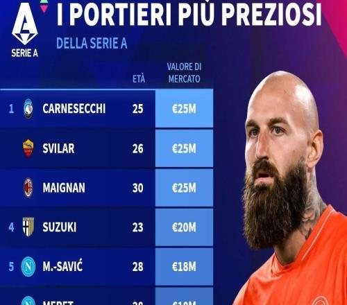 • 意甲门将身价前10:迈尼昂等3人2500万第1,铃木彩艳2000万第4